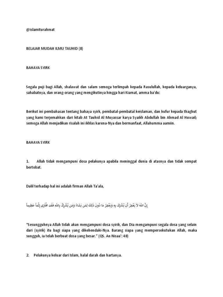 Download as PPT, PDF, TXT or read online from Scribd. Cahaya Tauhid Di Tengah Kegelapan Syirik. Syirik kecil tidak menjadikan pelakunya keluar dari agama Islam, tetapi ia mengurangi tauhid dan merupakan wasilah (perantara).